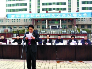 回應(yīng):記者在富平縣法院網(wǎng)看到該網(wǎng)站刊載了一張公開處理大會(huì)的照片,3月5日當(dāng)天,站在富平縣政府廣場(chǎng)上念稿子的官員正是該縣法院副院長(zhǎng)奧繪。背后列席的官員中,該縣政法委及法院的主要領(lǐng)導(dǎo)都在。