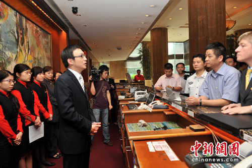 希爾頓重慶總經(jīng)理冀宏飛向檢查驗收組介紹說,在被警方停業(yè)整頓后,重慶希爾頓酒店對酒店高層、主管和員工進行了培訓(xùn),集中學(xué)習(xí)政府和警方相關(guān)的法律法規(guī)。來自希爾頓(中國)上?偛康膬擅0膊扛吖芙裉煲矊⒌诌_重慶,對重慶希爾頓酒店的安保人員進行培訓(xùn)和重組。
