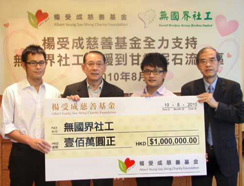 楊受成昨日以“楊受成慈善基金”名義,捐出一百萬港元予無國界社工。無國界社工將派出五名義工于本周五或以前到災區(qū)視察災情,并安排該一百萬元善款購買災民目前最需要的物資,例如一般生活必需品等。首批物資最快可于本月二十日送到災民手中。