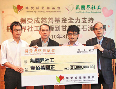 而任“無(wú)國(guó)界社工”永遠(yuǎn)榮譽(yù)會(huì)長(zhǎng)的英皇集團(tuán)主席楊受成昨日以“楊受成慈善基金”名義捐出100萬(wàn)港元予無(wú)國(guó)界社工,并安排該組織之支持團(tuán)隊(duì)親赴災(zāi)區(qū)協(xié)助賑災(zāi)工作!盁o(wú)國(guó)界社工”將派出5名義工于本周五或以前到災(zāi)區(qū)視察災(zāi)情,并安排該100萬(wàn)元善款購(gòu)買災(zāi)民目前最需要的物資,例如一般生活必需品等。首批物資最快可于本月20日送到災(zāi)民手中。中聯(lián)辦社會(huì)工作部副部長(zhǎng)黃清芳出席支票交接儀式。