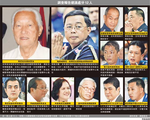 阿基諾三世昨在記者會上透露,調(diào)查報告建議他對12名官員及傳媒工作者作行政或刑事檢控,包括市長林雯洛、內(nèi)政部副部長普洛、正副申訴專員、前警察總長、談判專家、特警指揮官及當日與門多薩做直播訪問的電臺節(jié)目主持人等。