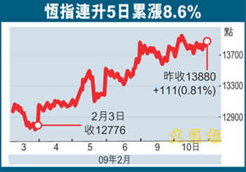 中新網(wǎng)2月11日電 據(jù)香港《文匯報(bào)》報(bào)道,港股連升5天,合計(jì)共升約1100點(diǎn),恒指10日收報(bào)13880點(diǎn),升111點(diǎn),成交421億。內(nèi)地傳出振興石化行業(yè)計(jì)劃,包括提高暴利稅起征點(diǎn),石油股上升,加上內(nèi)地股市升勢強(qiáng)勁,有證券界人士認(rèn)為市場在觀望美國通過救市方案后,恒指短期內(nèi)有機(jī)會上試14000點(diǎn)。