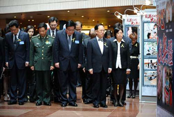 12日下午2時28分,香港文化中心一片肅穆。在參觀“蜀港同心大愛無疆──汶川大地震一周年紀(jì)念圖片展”后,曾蔭權(quán)與高祀仁連同駐港部隊(duì)司令員張仕波少將、中聯(lián)辦副主任李剛、外交部駐港副特派員詹永新、政制及內(nèi)地事務(wù)局局長林瑞麟、民政事務(wù)局局長曾德成和勞工及福利局局長張建宗等一眾嘉賓,一同肅立默哀一分鐘,哀悼汶川大地震遇難同胞。