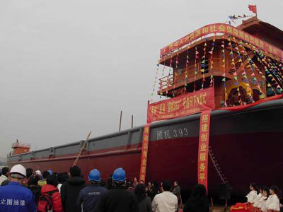 圃機393號船身長80米,排水量約齊千噸,載重可達5000噸,號稱珠江三角洲第一艘甲板工程船。該船將用于港珠澳大橋工程運輸,包括搬運石頭、攪拌機等,目前已簽約運輸石30萬立方米,每天運輸3500立方米,為港珠澳大橋建設(shè)打基礎(chǔ)。