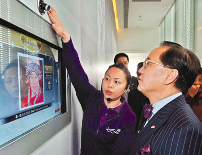為推介香港館,煲呔(曾蔭權(quán))不惜“粉墨登場”扮演粵劇大老倌?非也,原來香港館在入口處歡迎參觀者的是一個計算機(jī)造型游戲,曾蔭權(quán)親身上陣,一試游戲:“毋須粉墨也能裝一下大老倌,然后把趣怪扮相電郵給朋友!