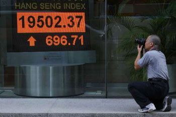 香港股市20日跟據(jù)外圍高開200點,輕易升破19000點關(guān)口拾級而上,中午收市升447點,在深滬股市推波助瀾之下,港股午市升勢持續(xù)擴大,最多升700點,金融股及地產(chǎn)股齊齊為股市添動力,指數(shù)以接近全日高位收市,報19502點,上升696點或3.7%,多只藍籌股重返去年由雷曼爆煲引發(fā)的金融海嘯前水平,國企指數(shù)升幅超過4%或446點,收市報11593點。