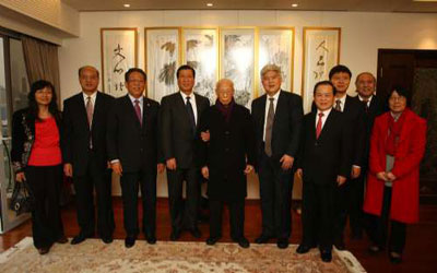 24日香港寒風(fēng)凜凜,但國(guó)學(xué)大師饒宗頤位于跑馬地的居所愛賓室里,卻洋溢著暖暖春意。陳進(jìn)玉一行帶著溫家寶總理和國(guó)務(wù)委員馬凱的新春祝福,以及親筆簽名的新春賀卡,在傳統(tǒng)新春佳節(jié)到來前夕,專程來港探望饒宗頤。小小會(huì)客室賓朋滿座,歡聲笑語不絕于耳,與墻上的饒老得意之作愛賓室題字相映成趣。
