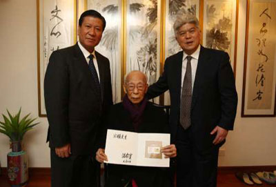 陳進(jìn)玉代為轉(zhuǎn)交這份千里之外的濃濃祝福,饒老接在手中,凝神細(xì)望,若有所思,笑得開懷:“虎年,好年”。陳進(jìn)玉轉(zhuǎn)達(dá)了溫總理的新春?jiǎn)柡。他說,饒宗頤先生為弘揚(yáng)中華民族優(yōu)秀傳統(tǒng)文化、促進(jìn)國(guó)家文化建設(shè)提出了許多寶貴意見。去年初饒老獲溫總聘任,擔(dān)任中央文史研究館館員,當(dāng)?shù)弥埨媳M管年事已高,仍關(guān)注國(guó)家文化建設(shè)時(shí),溫總深受感動(dòng),也十分關(guān)心饒老的健康和生活,百忙之中,仍將饒老安康緊系心頭。