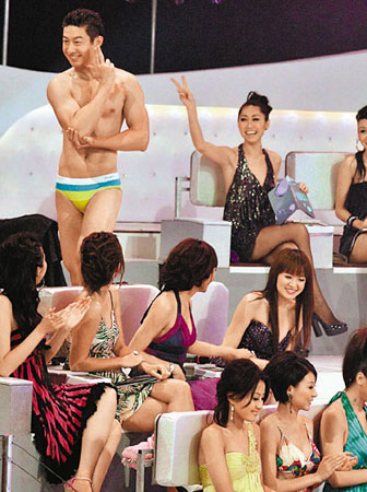到最討女評(píng)判歡心的泳裝環(huán)節(jié),先由一眾前輩港男以沙灘裝出場(chǎng),突然齊齊脫去上衫秀肌肉,女觀眾已經(jīng)大叫,到12位港男輪流濕身展示肌肉及性感小泳褲,尤其1號(hào)重要部位激突,現(xiàn)場(chǎng)女士無(wú)一不熱血沸騰。其中5號(hào)、6號(hào)與女舞蹈員共舞之時(shí),跣手不慎按到女方胸部位置。