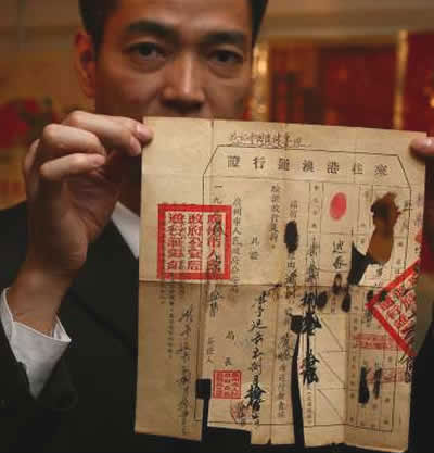 如今往來內(nèi)地香港兩地,電子過關(guān)系統(tǒng)便捷快速,原來在上世紀(jì)50年代,往來港澳通行證還要靠人手書寫。普藝拍賣有限公司副總經(jīng)理莊志崗介紹一張1953年由廣州發(fā)出的來往港澳通行證,雖然紙張已經(jīng)破損,當(dāng)中不少個人信息部分也被燒毀,但依然清晰可見當(dāng)年的發(fā)證版本和模式,尤其是所有內(nèi)容均由人手毛筆書寫,同如今發(fā)達科技下的電子版本相距甚遠(yuǎn)。