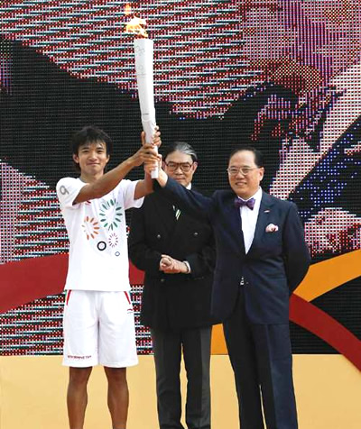 八月二十九日,東亞運(yùn)火炬接力跑在香港順利舉行,港協(xié)暨奧運(yùn)會(huì)會(huì)長(zhǎng)霍震霆、民政事務(wù)局局長(zhǎng)曾德成、政制及內(nèi)地事務(wù)局局長(zhǎng)林瑞麟、民政事務(wù)局常任秘書(shū)長(zhǎng)尤曾嘉麗等官員,及六十五名火炬接力手在灣仔金紫荊廣場(chǎng)舉行火炬跑閉幕儀式。 中新社發(fā) 鄧慶樂(lè) 攝