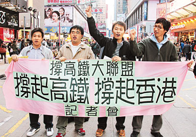 社交網站近日有人組成“撐起高鐵,撐起香港”群組,并已有逾萬名支持者。一群生于上世紀70及80年代的人士更組成“撐高鐵大聯(lián)盟”,上周成立“集會支持西九起高鐵”群組,目前已有逾1100名支持者。4名聯(lián)盟成員13日在旺角街頭,呼吁其他高鐵支持者本周五往立法會門外靜坐,以示“撐高鐵”的決心。