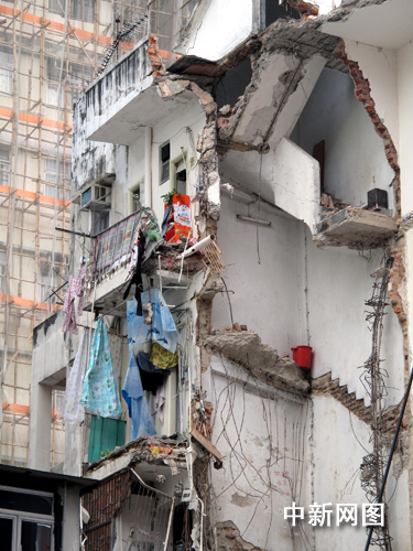 在微風(fēng)中,懸在剝露于外的墻壁上的美女海報(bào)、來不及收的晾曬衣物和家當(dāng),沿著樓梯痕跡排列的七倒八歪的信箱、放在已成為“懸崖”的墻角處的紅色膠桶、鐵架床床頭的毛絨玩具……訴說著一個(gè)個(gè)已不復(fù)存在的故事。震撼猶存,更令人唏噓。
