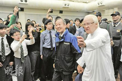 身穿藍色外套、系上母校領帶的高錕,7日出席母校圣若瑟書院成立135周年開放日開幕典禮。精神飽滿的高錕在全場熱烈掌聲下,由校監(jiān)湯瑪士修士陪同進入禮堂,太太黃美蕓則拉著高錕的外套,緊隨其后進場。