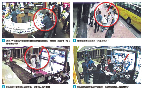 陳佑銘的遺孀、女兒及家屬經過極力要求,昨日獲安排到肇事珠寶店翻看事發(fā)時的閉路電視。據悉,家屬逗留該店半小時,當看到職員及導游對陳佑銘的態(tài)度時,家屬一度情緒激動,要由他人扶持下離開。