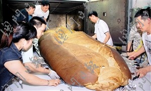 澳門豬扒包遠(yuǎn)近馳名,這次壯舉,由澳門女企業(yè)家與金馬輪咖啡餅店合作,并由金馬輪店焗制。巨型豬扒包長293公分、寬155公分、高33公分,共重540磅,動(dòng)用面粉200斤、豬扒80磅。從搓面粉、發(fā)酵等工序到最終“面世”,共耗時(shí)逾13小時(shí),需7個(gè)員工合力制作。
