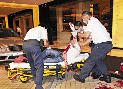 “泰龍”當(dāng)場(chǎng)身中逾7刀倒臥血泊中,殺手逞兇后跳上2車倒車逃去。同行友人驚魂剛定報(bào)警求救。救護(hù)員趕至將滿身鮮血已半昏迷的“泰龍”送往伊利沙伯醫(yī)院搶救,惜延至清晨5時(shí)57分不治。