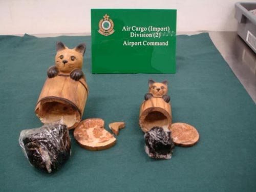 案情透露,海關(guān)機(jī)場科人員于9月27日清晨檢驗五件由清邁經(jīng)香港轉(zhuǎn)運(yùn)到加州,報稱“木制工藝品”的紙箱包裹。關(guān)員利用X光檢查后,發(fā)現(xiàn)箱內(nèi)物品可疑,并開箱割開多件“木制貓”雕刻品檢驗,發(fā)現(xiàn)內(nèi)里藏有用膠袋包裝的熟鴉片,共重約29公斤。