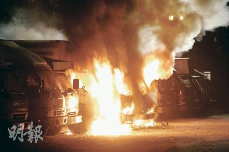 現(xiàn)場為何文田忠孝街56號的露天停車場,5輛被焚貨車并排停泊,部分車輛的駕駛室燒剩支架。其中一輛載有約40罐石油氣的貨車右車頭燒毀,幸貨斗內(nèi)的石油氣未被波及,否則后果嚴重。