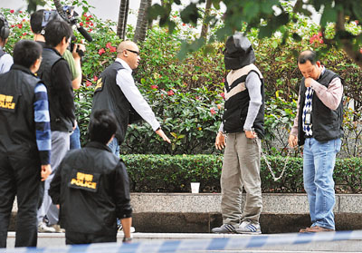 其中一名疑犯黑布蒙頭,腰間綁上鐵鏈,在灣仔區(qū)域法院對(duì)面重組案情。有組織罪案及三合會(huì)調(diào)查科探員在場(chǎng)調(diào)查,封鎖大廈出入口和附近行人路,并拍下整個(gè)過程。疑犯講述案發(fā)經(jīng)過。