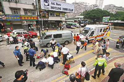 另外,一對來港探親、上了年紀(jì)的內(nèi)地姐弟,昨天上午11時45分在旺角染布房街近亞皆老街交通燈路口橫過南行線馬路時,1輛沿亞皆老街東行客貨車右轉(zhuǎn)入染布房街,弟及時閃避, 68歲陸姓老婦卻被客貨車撞個正著,當(dāng)場飛彈數(shù)呎倒地,頭破血流昏迷,送院情況危殆。肇事客貨車黃姓30歲司機(jī)事后在場助查,警方正調(diào)查是否有人不遵照交通燈號導(dǎo)致意外。