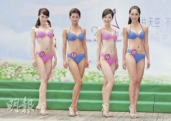 中新網(wǎng)10月15日電 據(jù)香港《文匯報(bào)》報(bào)道,2009年亞洲小姐選舉候選佳麗14日在香港荃灣一間酒店以泳裝在池畔與傳媒見(jiàn)面,但2號(hào)王,幓忌蠚夤苎兹毕挥18位佳麗亮相。大會(huì)安排佳麗穿上比基尼泳裝,各佳麗身裁都顯得突出。