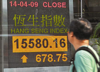 中新網(wǎng)4月15日電 據(jù)香港《文匯報(bào)》報(bào)道,外圍在復(fù)活節(jié)長(zhǎng)假期間,股市持續(xù)向好,令港股14日要追回有關(guān)升幅,恒指高開(kāi)401點(diǎn)后追貨買(mǎi)盤(pán)支撐大市,一眾當(dāng)炒股份向上,全日收?qǐng)?bào)15580點(diǎn),升678.7點(diǎn),升幅達(dá)4.5%,是今年1月7日港股跌穿15000點(diǎn)后,4個(gè)月以來(lái)首次重上15000點(diǎn)收市,且成交續(xù)增至754.21億元。