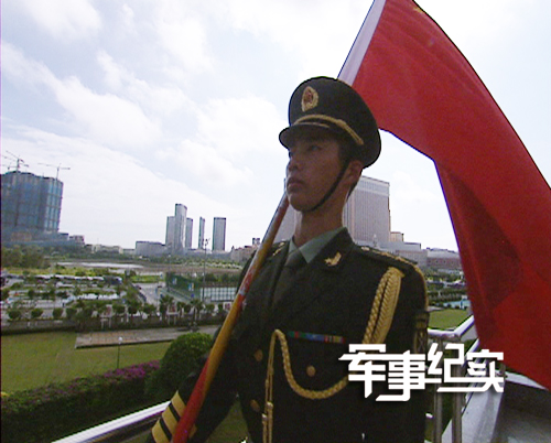 臨近退伍的一天,駐澳門部隊的氹仔軍營里,兩名戰(zhàn)士之間正在進行一次特殊的軍旗交接儀式。即將告別澳門部隊的王雨,將陪伴他一年多的軍旗移交到戰(zhàn)友的手里。接過軍旗的是左護旗手張文斌,從這一刻起,張文斌將承擔(dān)起老旗手交付的千鈞重擔(dān),將八一軍旗高高擎起在澳門的土地上。