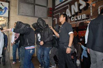警員進入酒吧后實時控制場面,繼而展開搜查,在店內3間貴賓房內先后搜出3把用紗布纏著刀柄長近3呎的開山刀及3柄牛肉刀,拘捕40男女,用膠塑帶兩人一組綁著押上警車帶署調查。