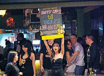 金融海嘯令香港酒吧生意一落千丈,美國(guó)軍艦這次訪港,預(yù)計(jì)會(huì)帶旺尖沙咀、灣仔及銅鑼灣一帶的消費(fèi),特別為區(qū)內(nèi)的酒吧帶來“及時(shí)雨”。不少酒吧東主得悉有大批美軍抵港,如久旱逢甘露,有酒吧更在門外掛上美國(guó)國(guó)旗作招徠,而大批衣著性感女郎,比平時(shí)更早“開工”,未及黃昏已經(jīng)在街頭向途經(jīng)大兵拋媚眼。