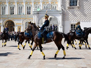 自2005年起,在氣候轉暖的4-10月,每逢周六中午克里姆林宮前就會進行總統(tǒng)衛(wèi)隊步兵和騎兵的換崗儀式。其中,每月的前三個周六在克里姆林宮廣場進行,剩下的在紅場進行。(梁旭)