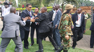 峰會(huì)第一天,利比亞總統(tǒng)衛(wèi)隊(duì)即與烏干達(dá)安全人員發(fā)生了拳腳沖突。根據(jù)CNN記者薩曼森納塔爾的描述,當(dāng)時(shí)正要舉行峰會(huì)開幕式。按照規(guī)定,只有國(guó)家首腦被允許進(jìn)入會(huì)場(chǎng)。利比亞總統(tǒng)衛(wèi)隊(duì)試圖護(hù)送卡扎菲通過入口,遂與烏干達(dá)安全人員發(fā)生爭(zhēng)論,隨后升級(jí)為肢體沖突,但是雙方?jīng)]有動(dòng)槍。