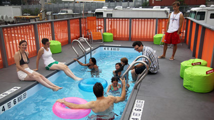 據(jù)報道,在曼哈頓的帕克大道,平時車水馬龍的街道在本月份的前三個周六暫時關(guān)閉,禁止車輛使用,取而代之的是由三個巨型垃圾箱改裝而成的游泳池。
