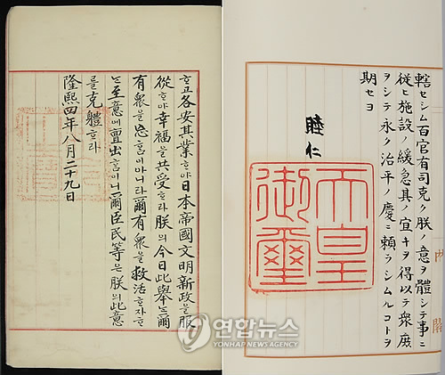 韓日合并當時第三任朝鮮統(tǒng)監(jiān)寺內(nèi)正毅于1910年8月22日全權委任大韓帝國總理大臣李完用勸說純宗皇帝在條約上簽名,純宗皇帝被逼無奈,印上國璽(大韓國璽),并在上方署名。但條約若要生效,須公布兩國皇帝的詔書。純宗在條約上署名后,寺內(nèi)正毅與李完用簽署有關雙方各自準備詔書的協(xié)議。再之后的8月29日,韓日兩國頒布了詔書。