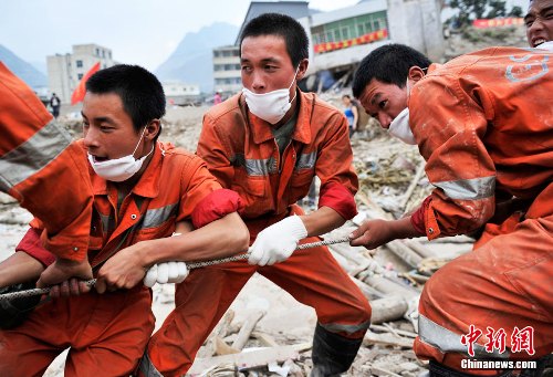 災(zāi)害發(fā)生后,救援人員和當(dāng)?shù)厝罕娫诰d延災(zāi)區(qū)兩公里多的廢墟上展開搜救,許多當(dāng)?shù)厝罕娛褂苗P子、鋤頭及繩索等工具營救被困同胞。