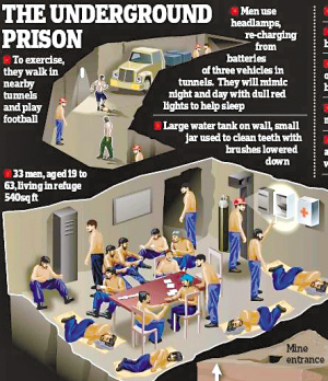 為了養(yǎng)活妻子和兩個(gè)年幼的孩子,巴斯托斯不得不前往智利北部尋找工作,幾經(jīng)周折,2個(gè)月后他終于在地處北部阿塔卡馬沙漠的圣何塞銅礦找了份礦工的工作。然而讓人做夢(mèng)也沒(méi)想到的是,剛剛逃離地獄的巴斯托斯,這一回竟然又跳入了“火坑”。8月5日,位于科比亞波市附近的圣何塞銅礦發(fā)生嚴(yán)重塌方,巴斯托斯與其他32名礦工被困井下700米處,直到17天后發(fā)被人發(fā)現(xiàn)時(shí),仍然奇跡般存活著。