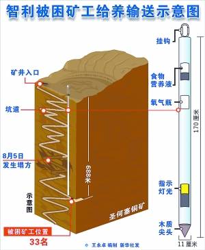 礦工烏爾阿回憶礦井坍塌時(shí)的恐怖場(chǎng)景:“太嚇人了,感覺(jué)就像整座山向我們壓來(lái)一樣。之后我們隱約看到了一個(gè)巨大的巖石,它將進(jìn)出通道給堵死了!33人躲在避難所內(nèi),每隔一天吃?xún)尚∩捉饦岕~(yú)罐頭和半塊餅干,用幾滴牛奶將這些食物沖進(jìn)肚子里。除了食物,他們還找到了地下水,這保證他們能夠活下來(lái)。經(jīng)過(guò)17天的等待,當(dāng)救援人員第8次將探桿深入地下時(shí),他們?cè)谏厦娼壣狭诵〖垪l,上面寫(xiě)著“我們?nèi)?3人都活著”。