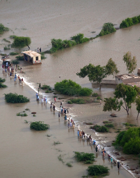 洪水已經(jīng)淹沒了巴基斯坦三分之一的土地,援助物資依然極為匱乏,工程師們經(jīng)常需要面對將洪水引向何方的困難抉擇。毀掉堤壩是控制洪水水位最常用的方式之一,謹(jǐn)慎行事可以減小洪災(zāi)的影響。可是,一些報道稱,旁遮普省Muzaffargarh地區(qū)的地方官員迫使工程師將洪水引向人口密集區(qū),而避開更小、更富裕的地區(qū)。