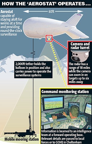 據(jù)報道,這種長約60英尺(約合18.3米)的氣球造價每個約為500萬英鎊,被駐阿富汗英國軍隊放置在高2000英尺(約合610米)的空中,下面栓著鋼鐵纜繩,將氣球固定住,同時通過纜繩將信號傳遞到電子基站。這種裝置能夠非常有效地偵測塔利班武裝分子的行蹤。