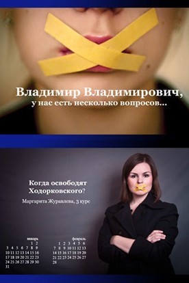 俄媒報(bào)道稱,此次的“另類”日歷照同樣來自莫斯科大學(xué)新聞系女學(xué)生。照片上的女大學(xué)生不再暴露身體,而是身著黑色套裝。令人注意的是,她們的嘴都用黃色膠條封住。每個(gè)日歷照都有女大學(xué)生向普京提出的自己無法理解或無法接受的問題。比如,有女學(xué)生寫道:“何時(shí)釋放霍多爾科夫斯基(其被視為普京宿敵)?”