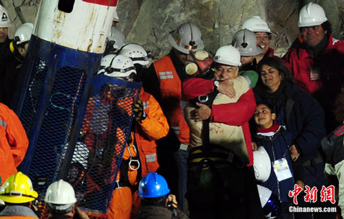 卡洛斯升井后跪倒在地,顯得十分激動。之后他與妻女熱烈相擁,礦友們也鼓掌相慶,智利總統(tǒng)皮涅拉上前擁抱送上祝福。玻利維亞總統(tǒng)莫拉萊斯答應(yīng)用總統(tǒng)專機(jī)將卡洛斯載回祖國。