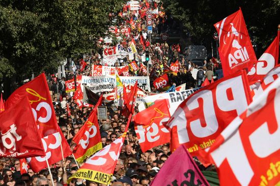 在薩科奇的親自推動下,法國這一輪的退休制度改革搞得如火如荼,總理菲永領(lǐng)導(dǎo)下的內(nèi)閣所提出的改革方案中最重要的內(nèi)容,已經(jīng)在9月份獲得法國國民議會(眾議院)通過,參議院也已經(jīng)在本月8日通過了提高退休年齡的法案,其余部分將在今日進(jìn)行最后表決。法國工會和學(xué)生發(fā)起聲勢浩大的全國性罷工和示威,就是想趕著表決之前,盡最大的努力加以阻止,就像1995年的那次致使全國交通運(yùn)輸系統(tǒng)癱瘓的大罷工,最終迫使希拉克政府不得不取消了養(yǎng)老金改革。