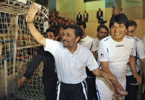 中新網(wǎng)10月29日電 據(jù)外電報(bào)道,伊朗總統(tǒng)穆罕默德·內(nèi)賈德和玻利維亞總統(tǒng)莫拉萊斯長(zhǎng)久以來(lái)因相似的政治立場(chǎng)和對(duì)美國(guó)的尖銳批評(píng)而為世界所矚目。現(xiàn)在,他們又站在同一陣營(yíng)中,不過(guò)這一次是在五人制足球場(chǎng)上。