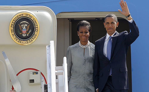 報道稱,奧巴馬乘坐的“空軍一號”專機于當(dāng)?shù)貢r間中午12時50分左右降落孟買國際機場。美國總統(tǒng)和第一夫人走出機艙向迎接的美印兩國政要招手致意。