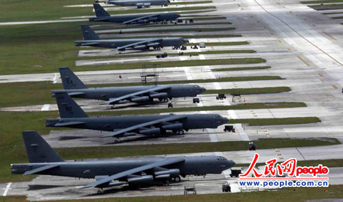 目前美海、空軍在關(guān)島部署了大量的先進(jìn)武器裝備。美空軍在關(guān)島組建了一個(gè)“全球打擊特遣隊(duì)”,包括6架B-2隱形轟炸機(jī)、12 架KC-135空中加油機(jī)、48架F-15E戰(zhàn)斗機(jī)和1架“全球鷹”無人偵察機(jī)。同時(shí),美國(guó)最先進(jìn)的隱形戰(zhàn)斗機(jī)“猛禽”F-22還定期飛往關(guān)島駐訓(xùn),且未來將永久部署關(guān)島。