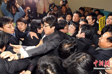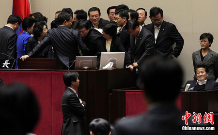 在韓國議會,這類激烈沖突已經(jīng)屢見不鮮。遇到自己強烈反對的議案或者提議時,議員們通常會用“武力”表達(dá)自己的不滿。嚴(yán)重時,議員利用桌椅、滅火器群毆,甚至有人被打掉牙。