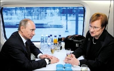 俄羅斯與芬蘭之間首條高速鐵路12日正式開通,俄羅斯總理弗拉基米爾·普京和芬蘭總統(tǒng)塔里婭·哈洛寧共同乘坐首班列車。普京在下車后開玩笑說,由于車速過快,他和哈洛寧都沒有足夠時(shí)間交談。這條鐵路是連接俄羅斯和歐洲其他國家的首條高鐵。