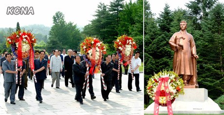 金正恩送來的花圈,擺放在金亨稷銅像和墳墓前。朝鮮勞動黨中央委員會政治局常委金永南、崔永林、崔龍海,以及朝鮮各級領導干部、人民軍官兵、群眾和青年學生參加敬獻花圈儀式。