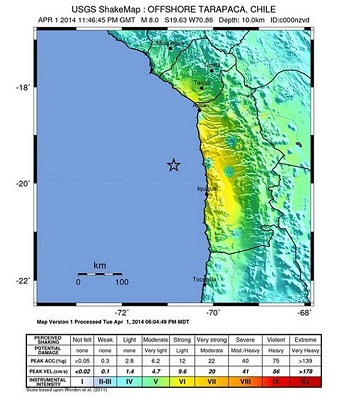 當(dāng)?shù)貢r間4月1日晚8點49分,里氏8.2級地震襲擊了智利北部附近海域,強震隨即引發(fā)2.5米高海嘯。據(jù)加拿大環(huán)球新聞網(wǎng)站4月2日報道,該地區(qū)在過去1個月內(nèi)已經(jīng)發(fā)生了近100次2.5級以上地震,這次強震僅是其中之一。
