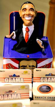 自當(dāng)選總統(tǒng)的那一刻起,奧巴馬就成了商家的“搖錢樹”。隨著支持他的呼聲越來越高,各種以他為原型的商品層出不窮。T恤、籃球、棒球帽、戒指、鑰匙扣、筆、杯子應(yīng)有盡有。在大街小巷,隨處可以看到和奧巴馬有關(guān)的小物品,諸如香煙、拳擊短褲、熱狗、高爾夫球、唇膏、腕表等,各色各樣,琳瑯滿目。